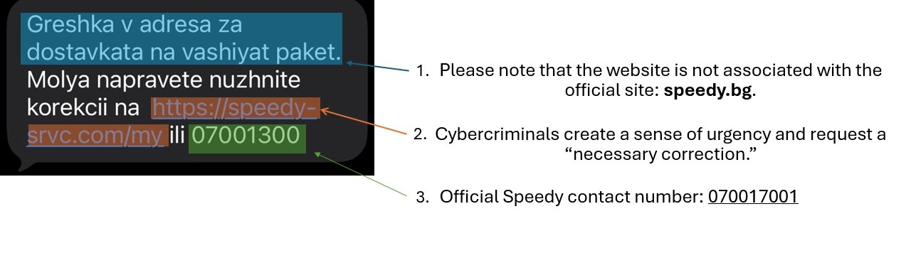 - The phone number from which the message was sent is not associated with Speedy AD. All official SMS messages from the company are sent from the number 170000 or via Speedy’s official Viber channel.