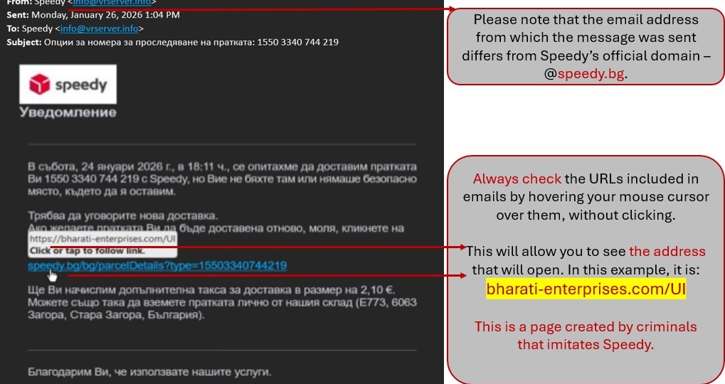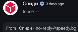 - The email address from which the message was sent is not associated with Speedy AD. All official communications from the company are sent from short number 170000, via Speedy’s official Viber channel, or from [email protected]
